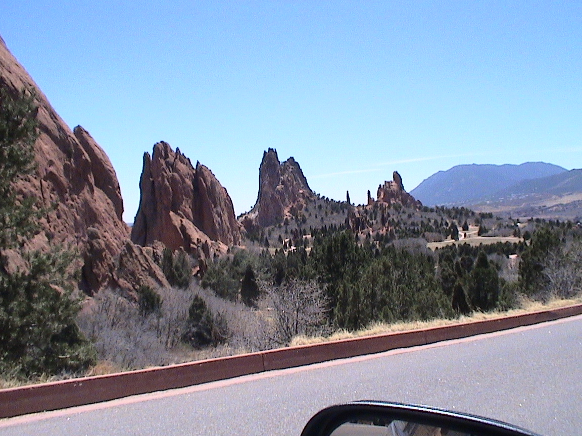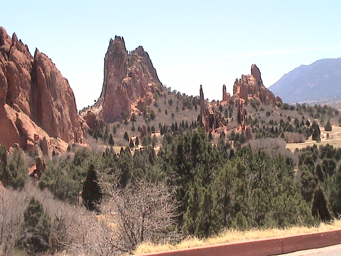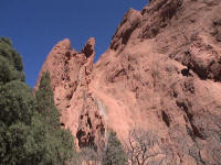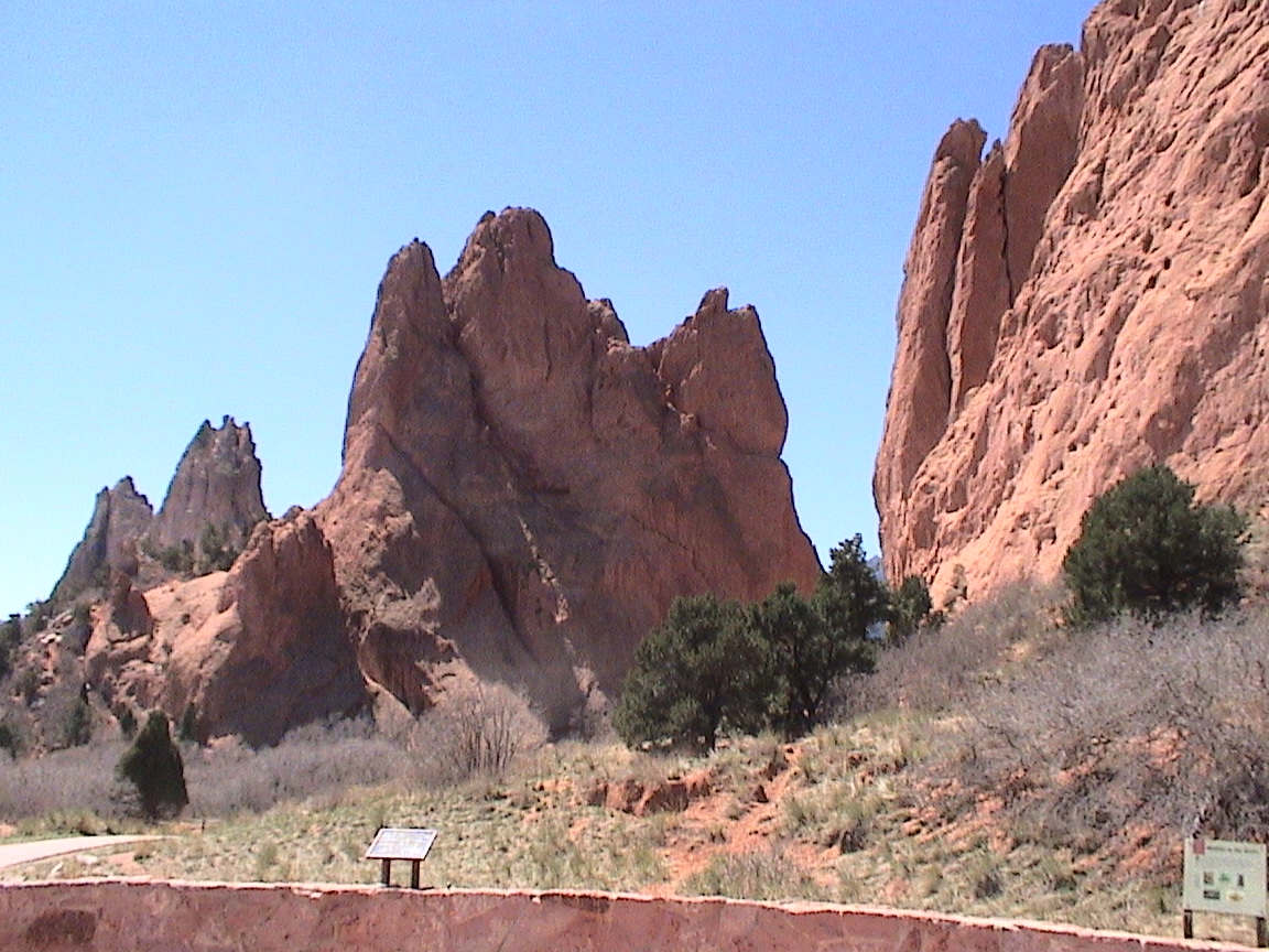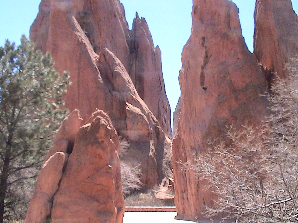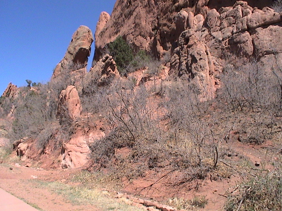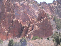 Take a walk with me through the Garden of the Gods! You can click on any of them to enlarge them. There were numerous signs forbidding climbing and disturbing the surroundings, but there were also a few places where you could climb - if you brought the proper gear and had permission. You'll get some idea of what it was like, but the camera just doesn't capture the rich colour. The vertical alignment of the layers and the erosion of the softer material between them made for some striking looks. What I found quite interesting was that all the surrounding rocks were light gray and that really set this "Garden" apart.