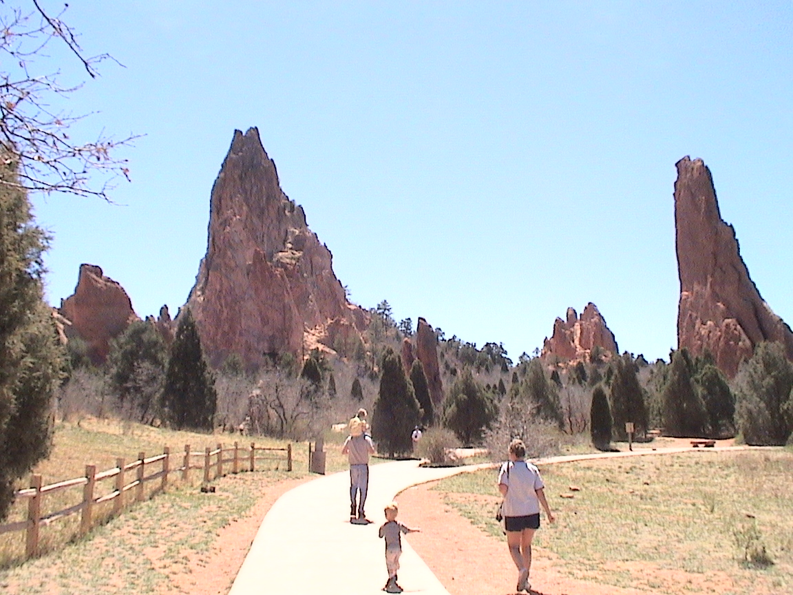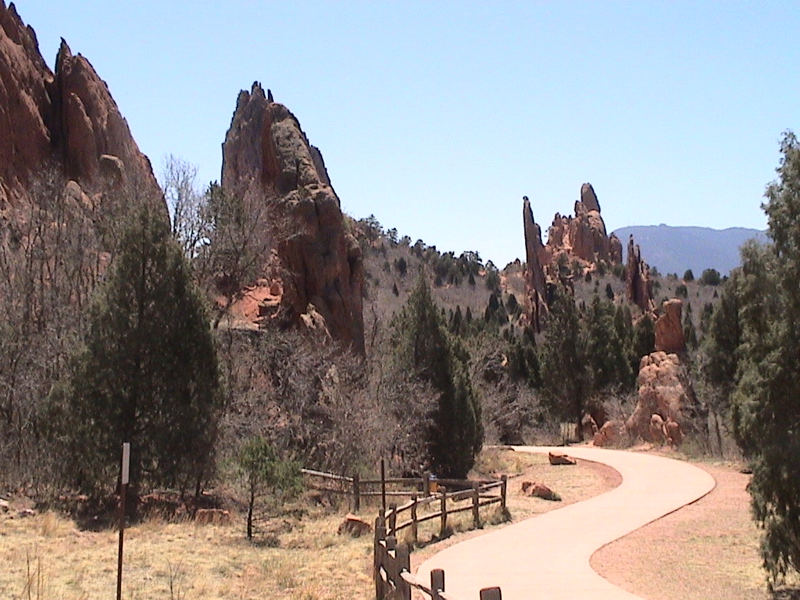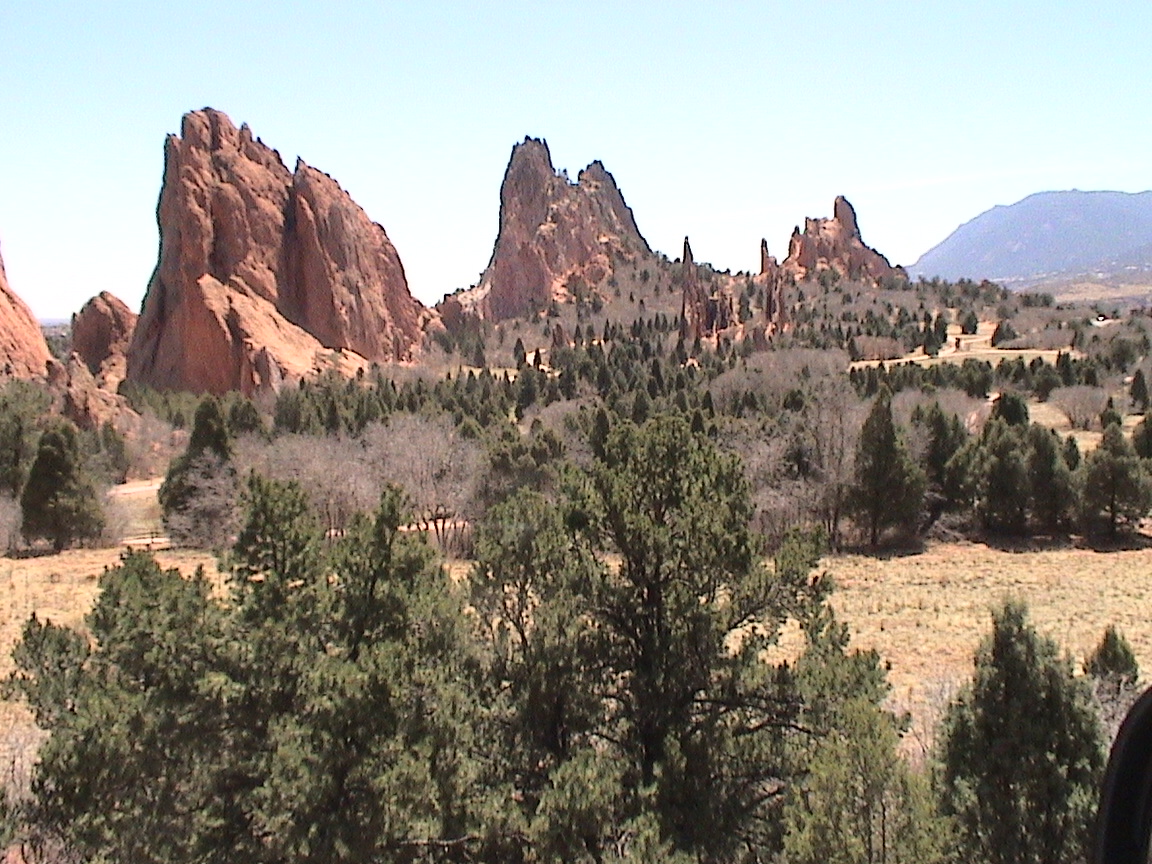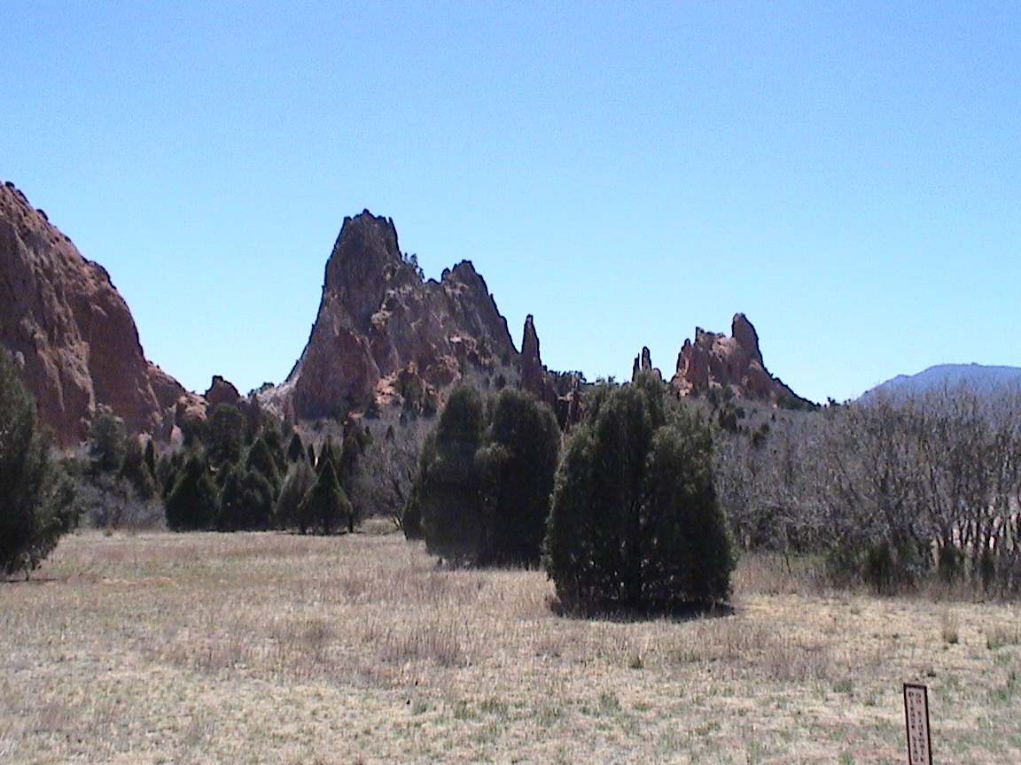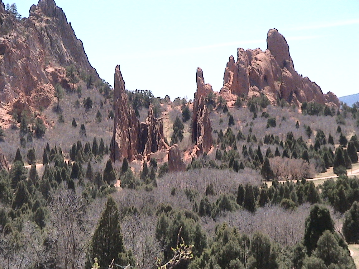 Take a walk with me through the Garden of the Gods! You can click on any of them to enlarge them. There were numerous signs forbidding climbing and disturbing the surroundings, but there were also a few places where you could climb - if you brought the proper gear and had permission. You'll get some idea of what it was like, but the camera just doesn't capture the rich colour. The vertical alignment of the layers and the erosion of the softer material between them made for some striking looks. What I found quite interesting was that all the surrounding rocks were light gray and that really set this "Garden" apart.