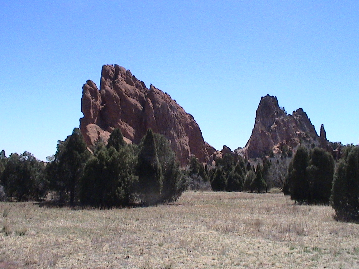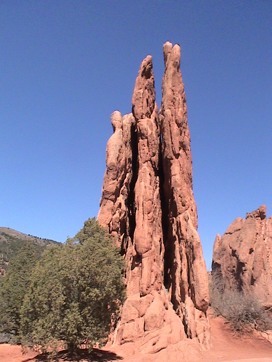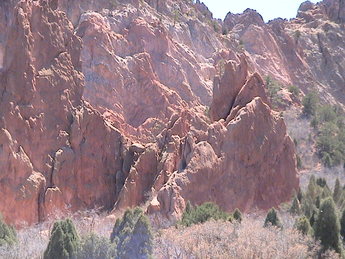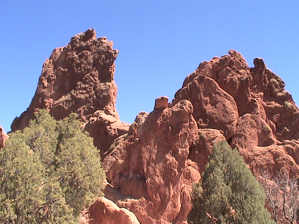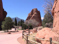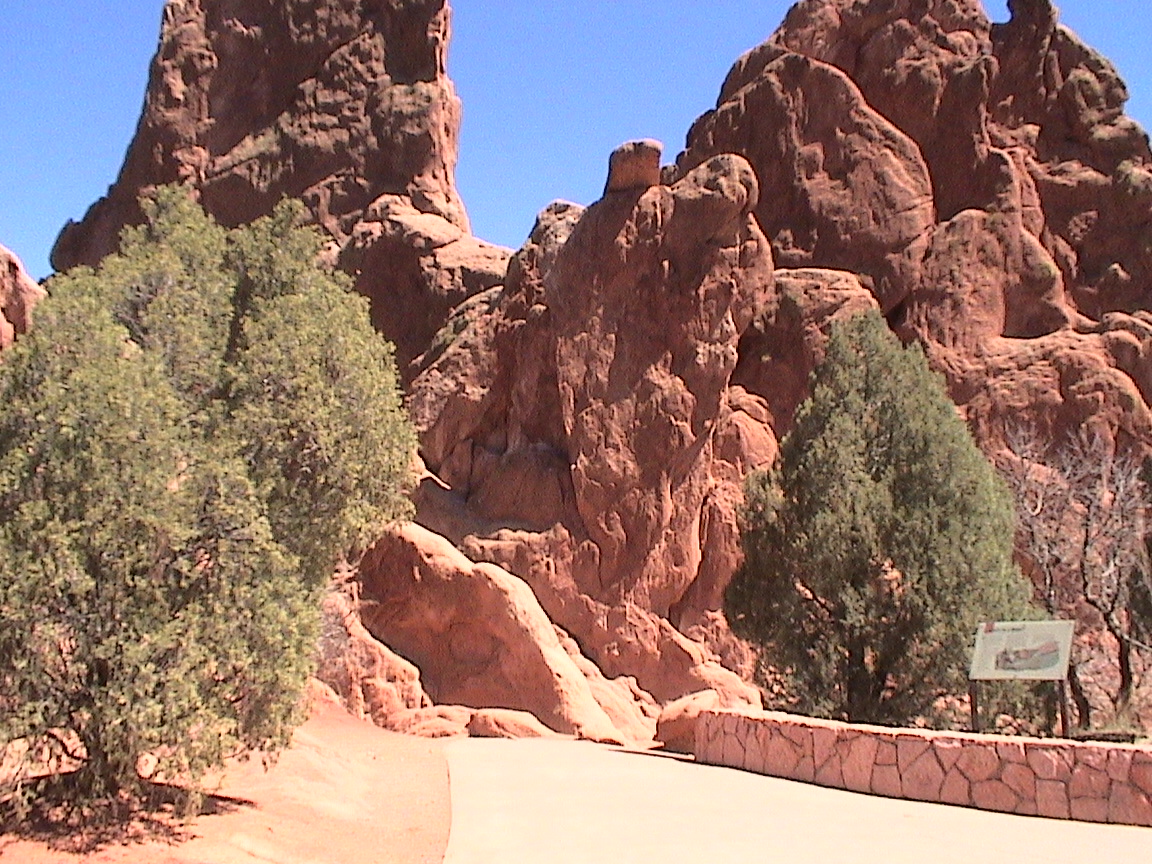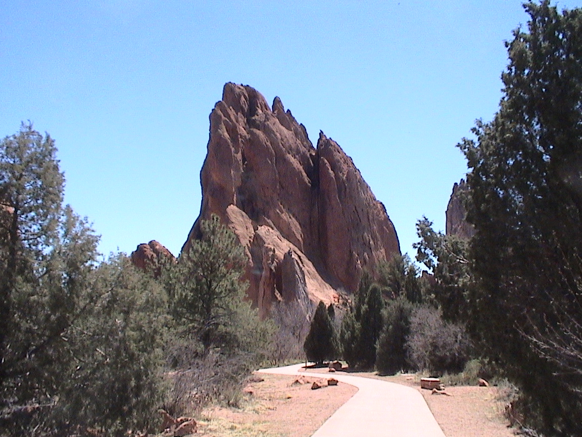 Take a walk with me through the Garden of the Gods! You can click on any of them to enlarge them. There were numerous signs forbidding climbing and disturbing the surroundings, but there were also a few places where you could climb - if you brought the proper gear and had permission. You'll get some idea of what it was like, but the camera just doesn't capture the rich colour. The vertical alignment of the layers and the erosion of the softer material between them made for some striking looks. What I found quite interesting was that all the surrounding rocks were light gray and that really set this "Garden" apart.