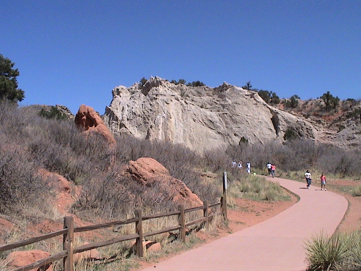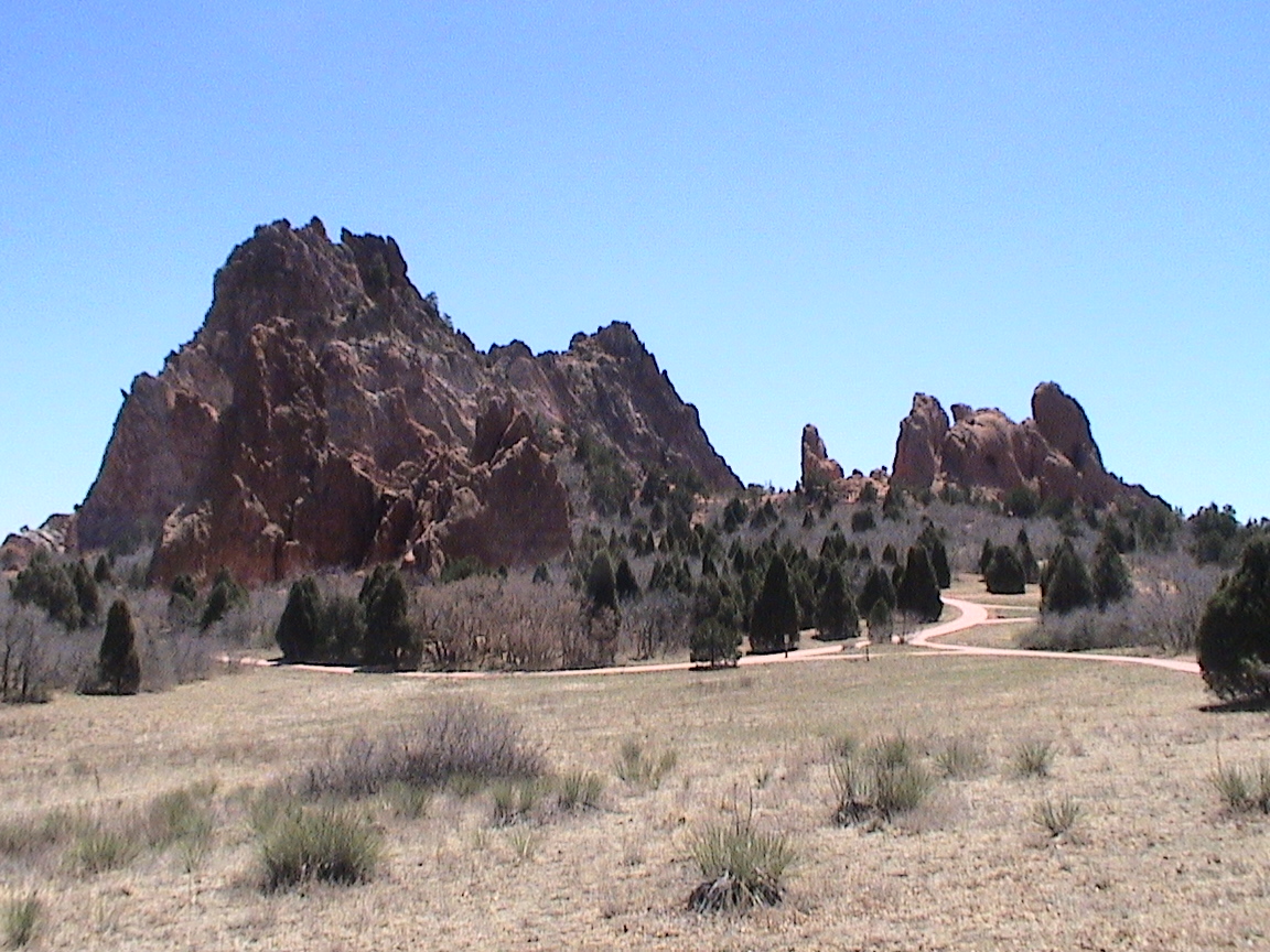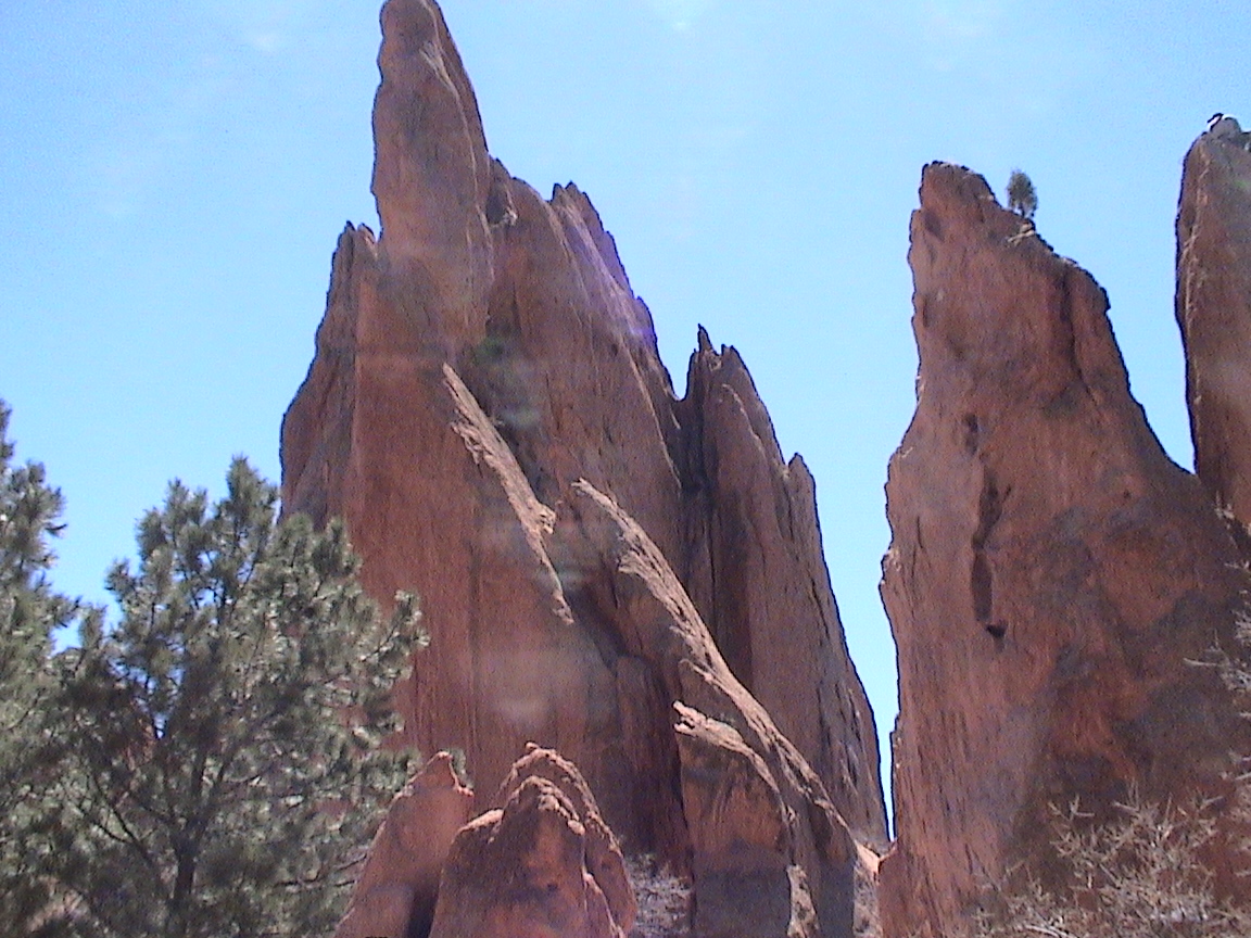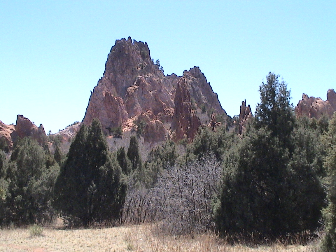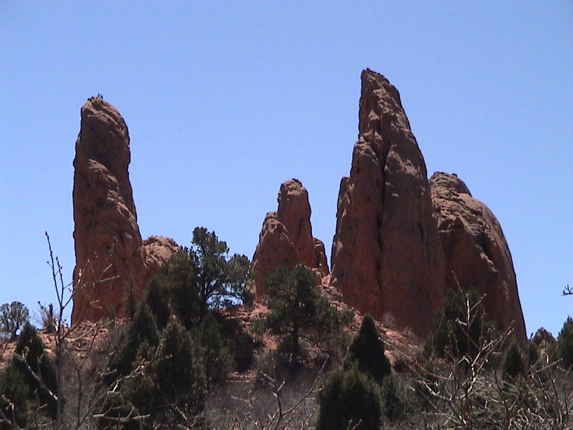 Take a walk with me through the Garden of the Gods! You can click on any of them to enlarge them. There were numerous signs forbidding climbing and disturbing the surroundings, but there were also a few places where you could climb - if you brought the proper gear and had permission. You'll get some idea of what it was like, but the camera just doesn't capture the rich colour. The vertical alignment of the layers and the erosion of the softer material between them made for some striking looks. What I found quite interesting was that all the surrounding rocks were light gray and that really set this "Garden" apart.